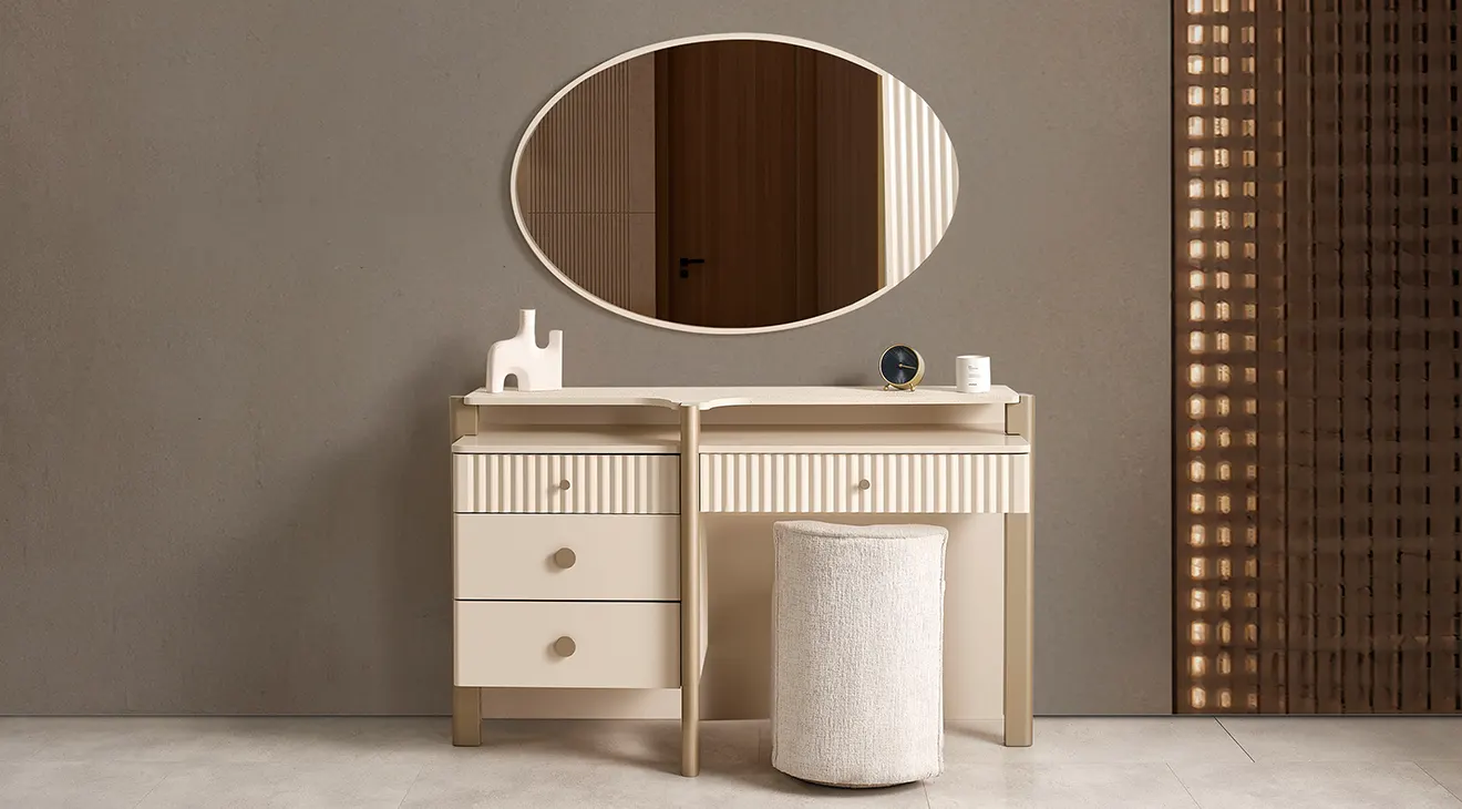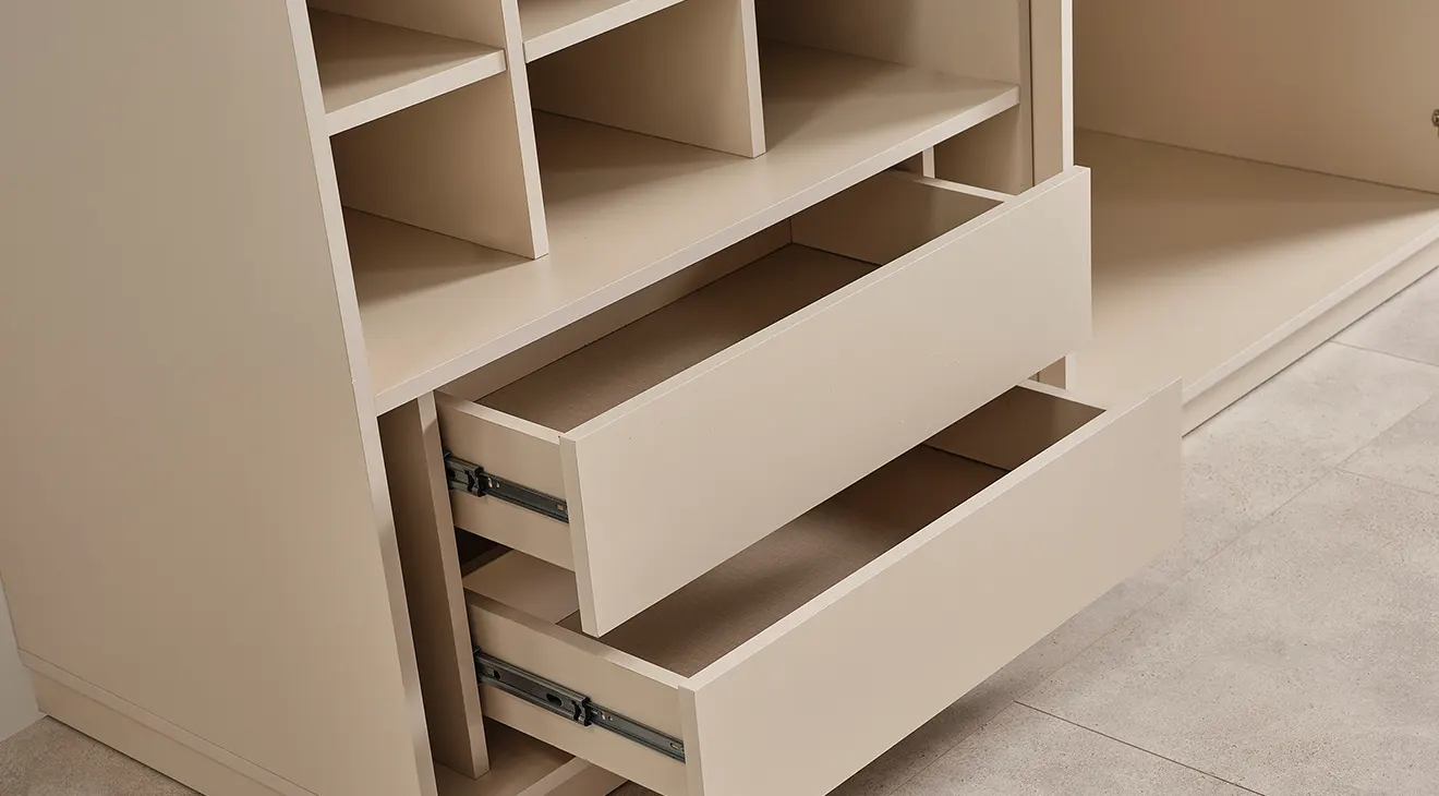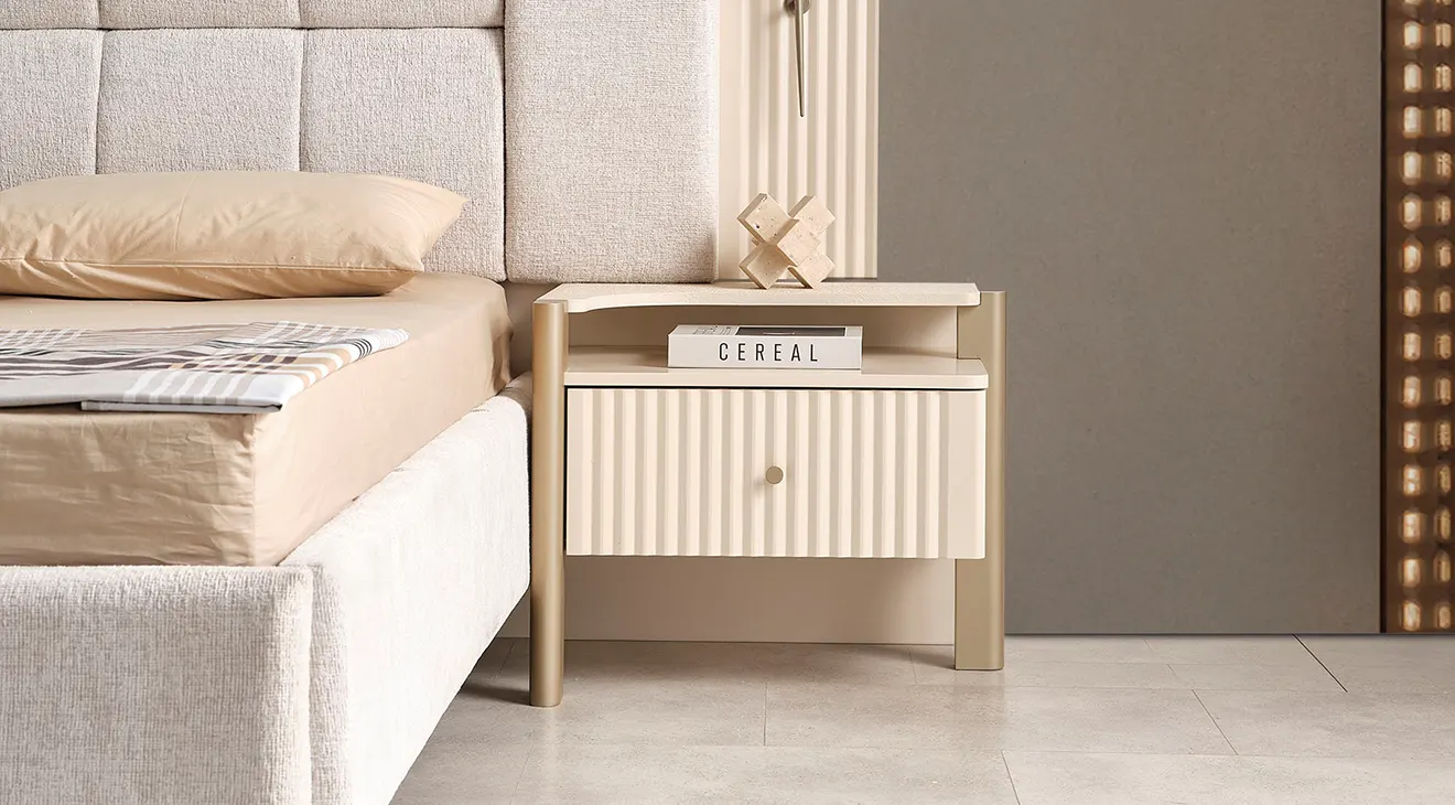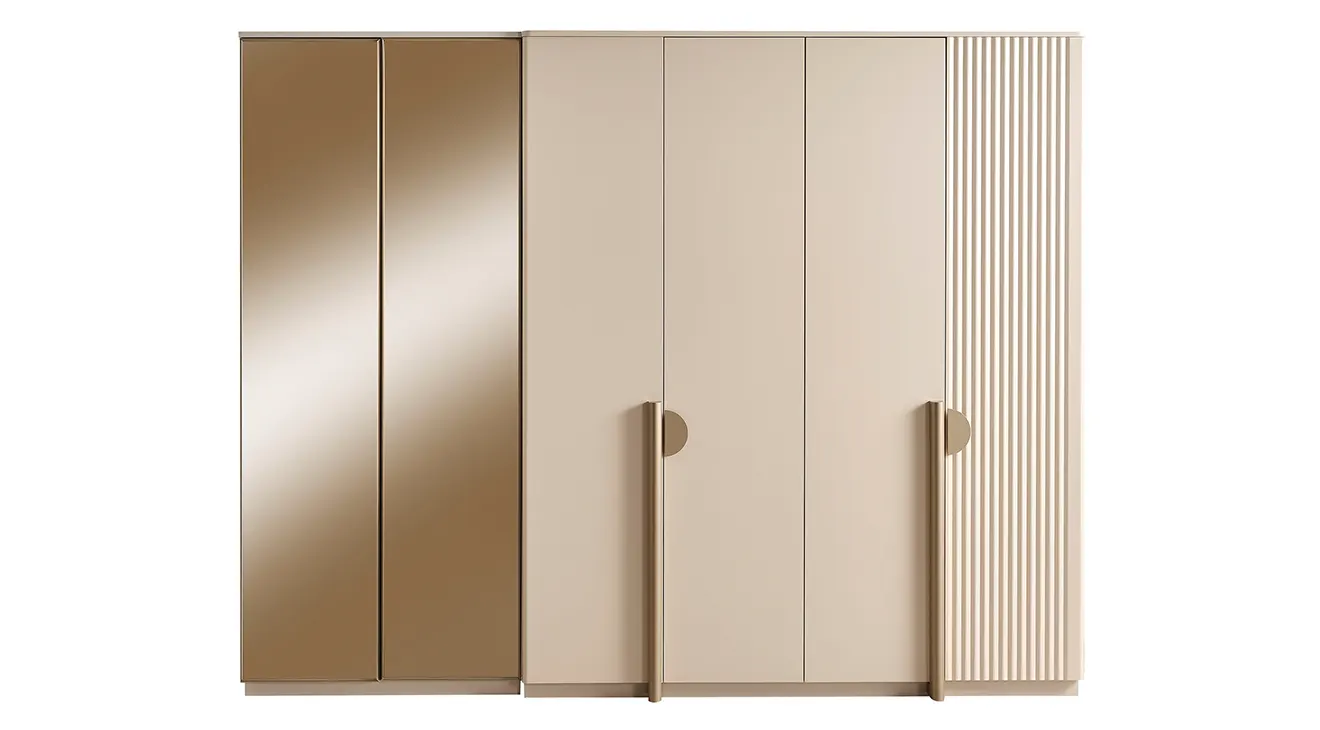 Krem tonlarının sıcaklığı, kapitone başlık ve yalın çizgilerle birleşiyor. 6 kapaklı, aynalı ve çok raflı gardırop; gömlekten nevresime her şeyi düzenli tutar. Komodin ve şifonyer yuvarlak hatlarıyla takımı tamamlar. Modern, sakin ve fonksiyonel bir yatak odası isteyenler için Zirve tam isabet.